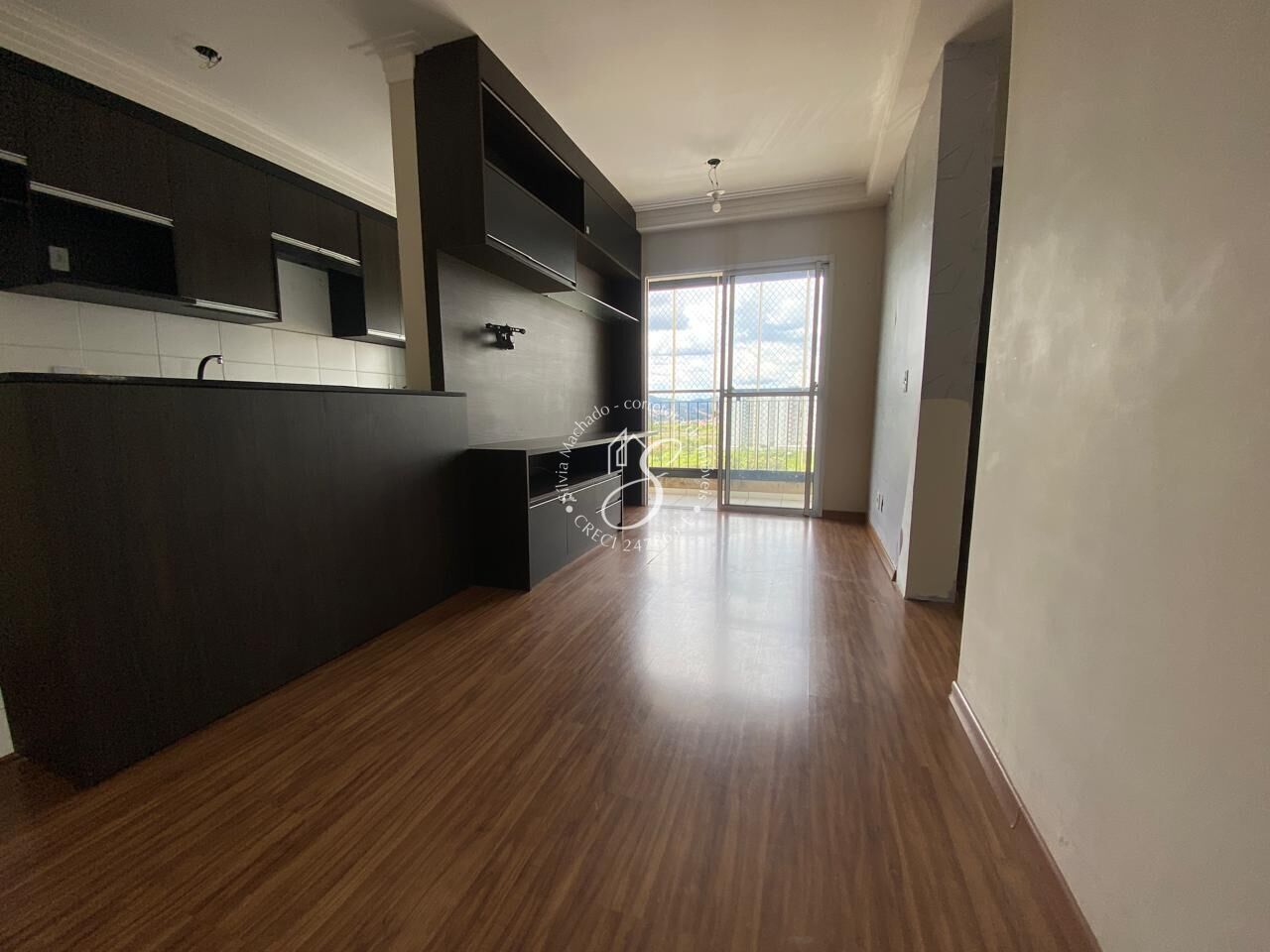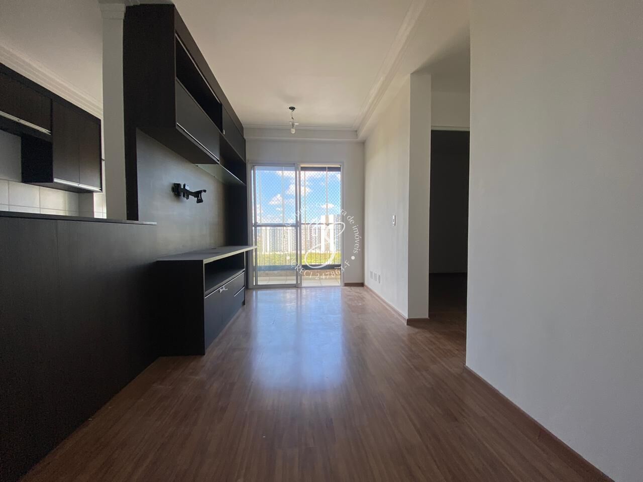 Sala para dois ambientes, painel, sacada envidraçada