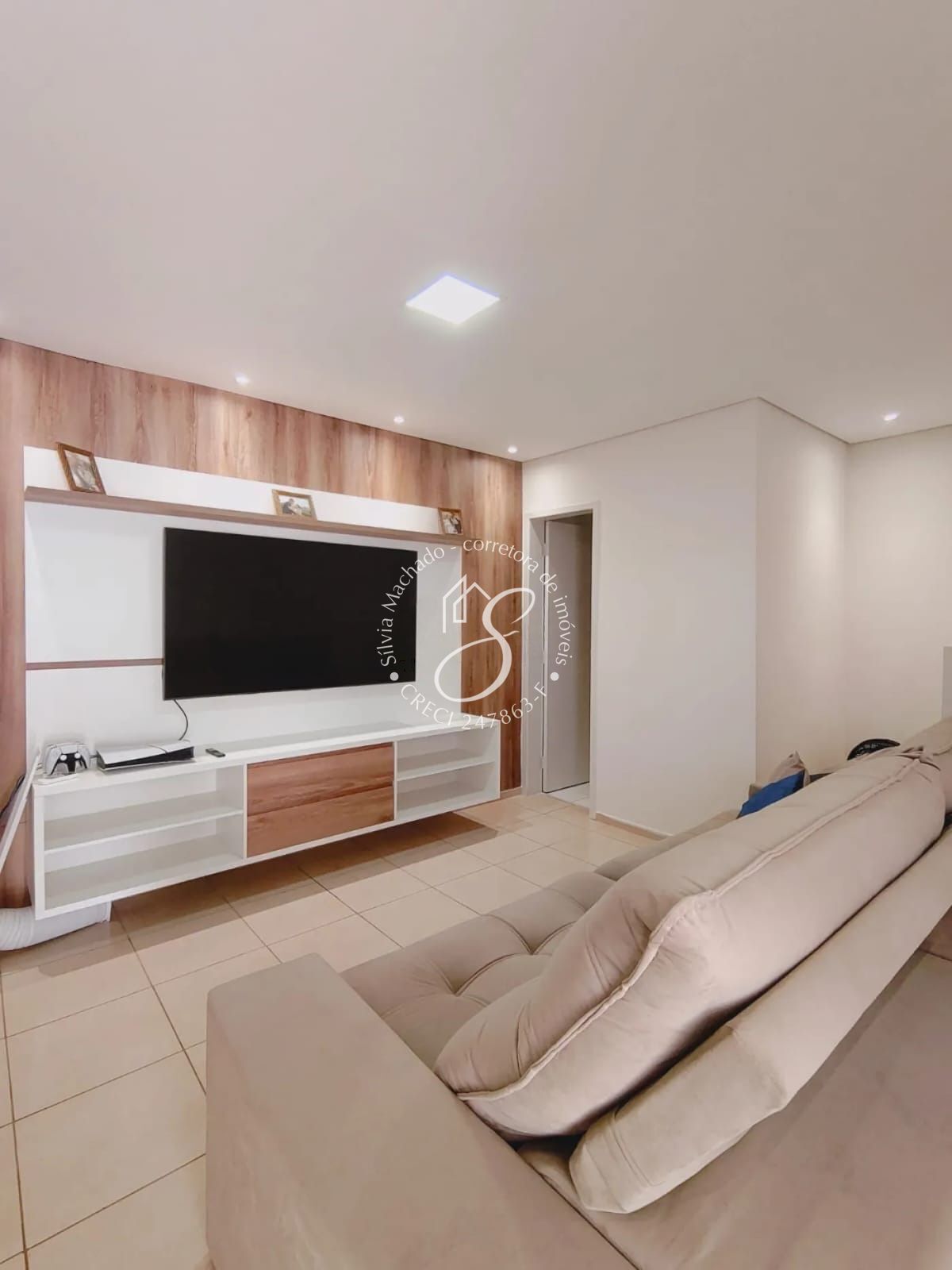 Sala ampla para dois ambientes, com painel de tv